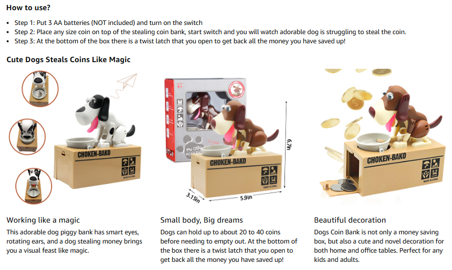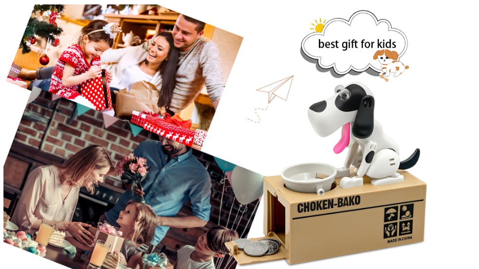 Premeňte obyčajné odkladanie mincí na veselý zážitok. Táto interaktívna pokladnička v tvare psíka „zje“ vašu mincu a vydá zábavný zvuk, ktorý si zamilujú deti aj dospelí.